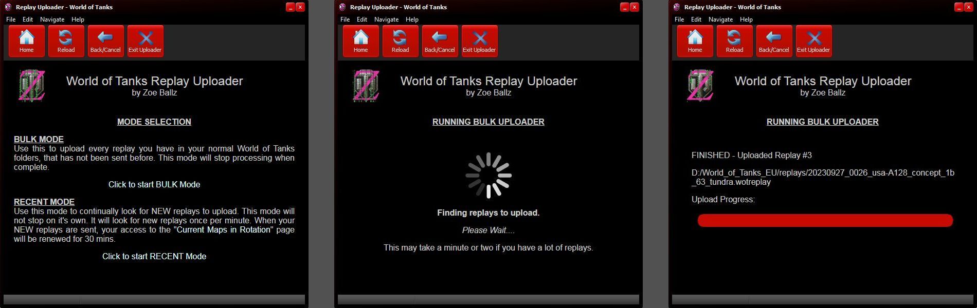 The replays will be used for analysis of all sorts of things, e.g. Have you ever thought "This tank was very accurate last month but this month I can't hit the side of a barn from the inside" ? Ever wondered if maybe there was a "quiet" nerf ? With enough replays I can get statistics for that kind of thing. Simply click the link below to download the Uploader App. It is a BULK uploader. You do NOT have to upload one at a time like on WoTReplays. It can upload them all with a few clicks. It can even upload your replays if you only keep the one from the "Last Battle". You can see the analyses I have already done listed further down.this page.